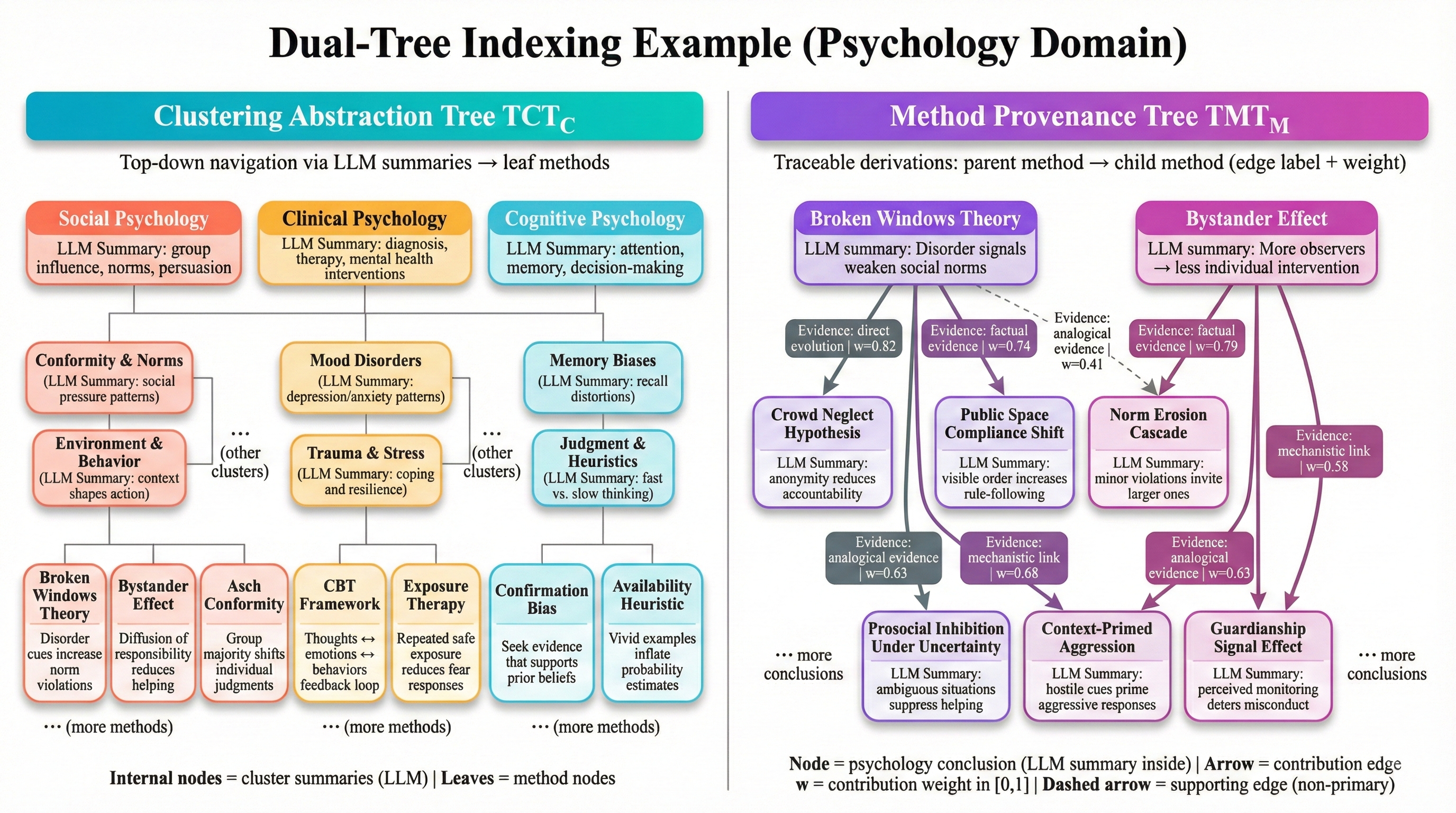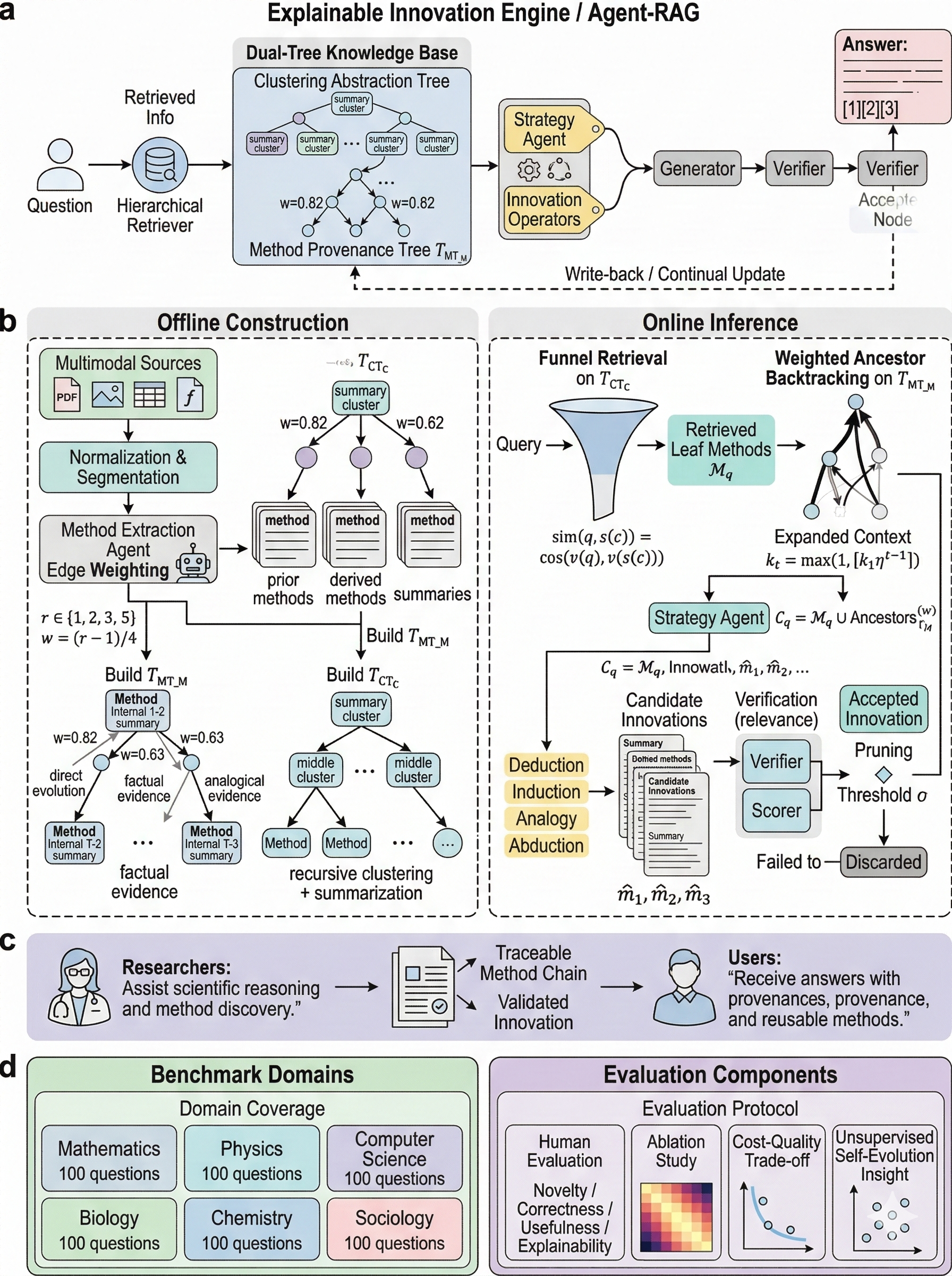 An Agent-RAG framework that organizes knowledge as method nodes with dual-tree indexing, strategy-guided synthesis, and verification-based pruning, enabling explainable and controllable innovation.